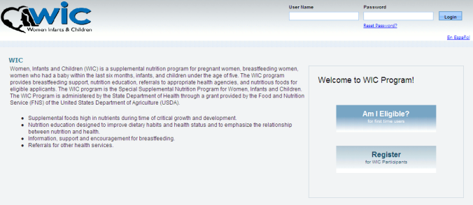 The Participant Portal is designed to allow you to apply for WIC services online. This WIC program collects and maintains information on individuals applying for participation. The program accommodates both English and Spanish languages depending on what is selected on the initial portal screen. The selected language remains as the default for all screens unless you change it.